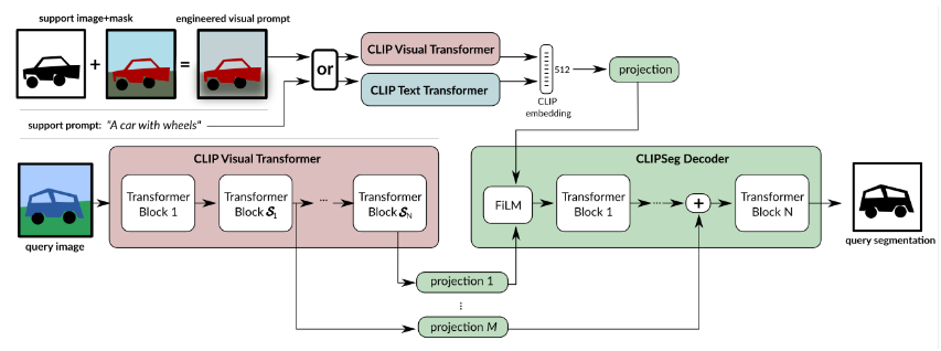 We introduce the CLIPSeg model which is capable of segmenting based on an arbitrary text query or an example image. CLIPSeg can address all three tasks named above. To realize this system, we employ the pre-trained CLIP model as a backbone and train a thin conditional segmentation layer (decoder) on top. We use the joint textvisual embedding space of CLIP for conditioning our model, which enables us to process prompts in text form as well as images. Our idea is to teach the decoder to relate activations inside CLIP with an output segmentation, while permitting as little dataset bias as possible and maintaining the excellent and broad predictive capabilities of CLIP.