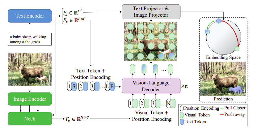 To tackle this issue, we design a text-to-pixel contrastive loss, which explicitly aligns the textual features with corresponding pixel-level visual features. … Given a transformed textual features and a set of transformed pixel-level features , a contrastive loss is adopted to optimize the relationship between two modalities, where is encouraged to be similar with its corresponding and dissimilar with other irrelevant . With the similarity measured by dot product, the text-to-pixel contrastive loss can be formulated as: …