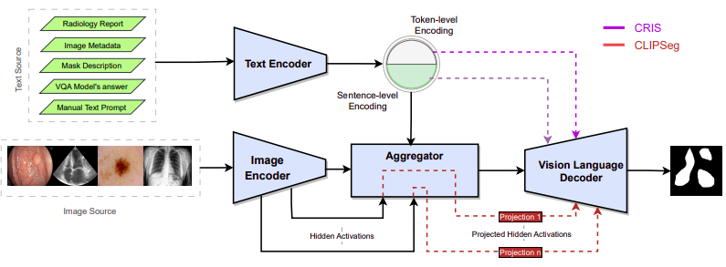 The basic architecture of CRIS and CLIPSeg/BiomedCLIPSeg VLSMs: