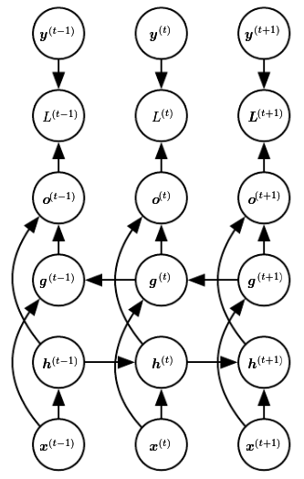 A typical bidirectional RNN with standing for the state of the sub-RNN that moves forward through time and standing for the state of the sub-RNN that moves backward through time: