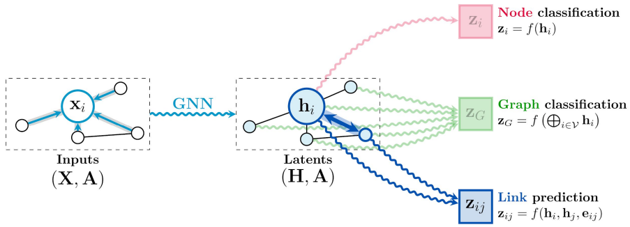 The convolutional flavor where the features of the neighborhood nodes are directly aggregated with fixed weights, typically depends on entries in A representing the structure of the graph. Here, are fixed weights, that specify the importance of node to node ‘s representation. Note that when the aggregation operator is chosen to be the summation, it can be considered as linear diffusion.