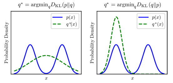 return np.sum(np.where(p != 0, p * np.log(p / q), 0))The KL divergence has many useful properties, most notably being non-negative. The KL divergence is if and only if and are the same distribution in the case of discrete variables. Because the KL divergence is non-negative and measures the difference between two distributions, it is often conceptualized as measuring some sort of distance between these distributions. It is not a true distance because it is not symmetric: for some and . This asymmetry means that there are important consequence to the choice of whether to use or :