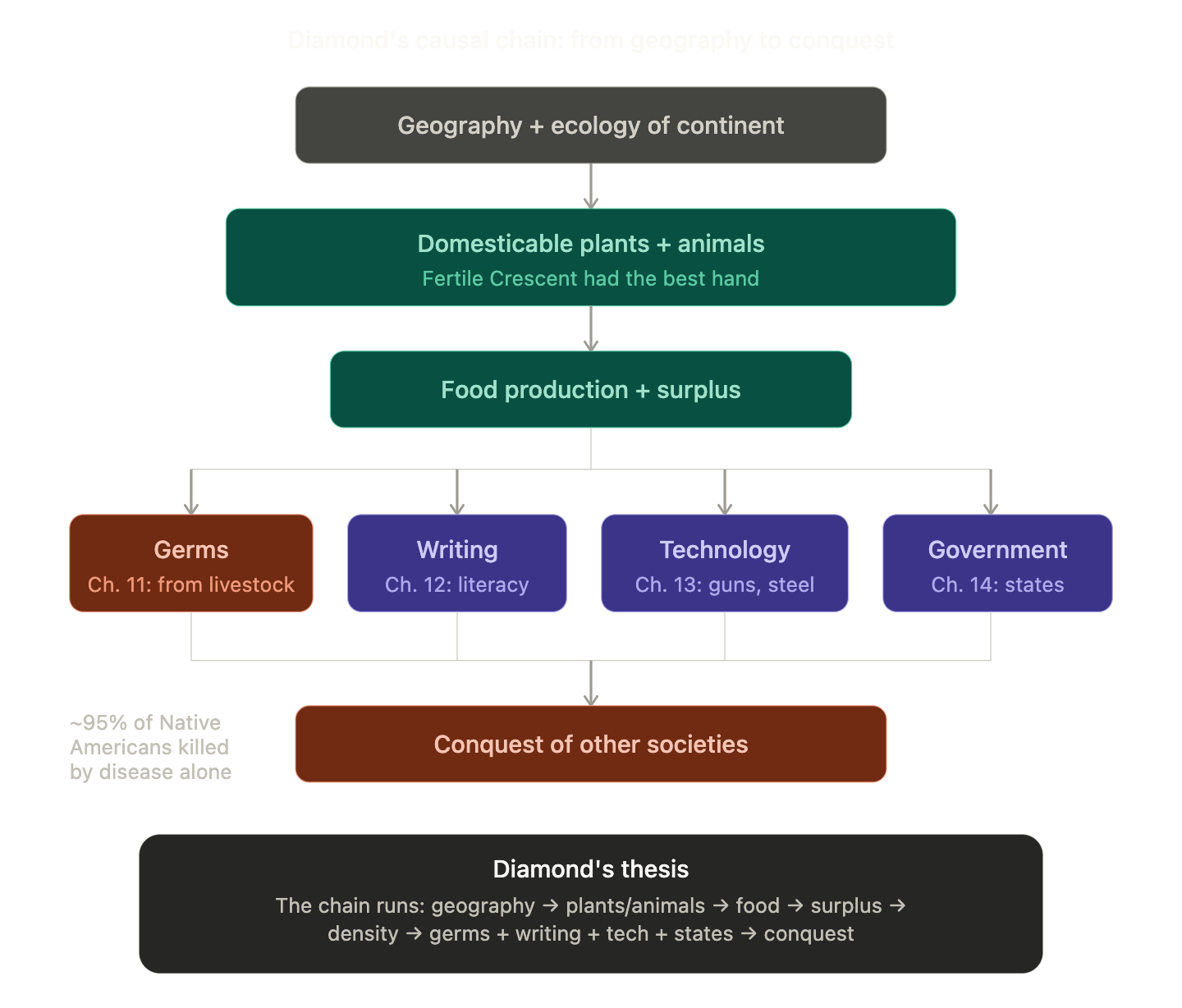 - Diamond’s conclusion: Africa’s peoples achieved everything their geography allowed and more. The differences between African and Eurasian history are fully explained by continental ecology and geography — axis, barriers, available species, disease environment — without invoking any differences in human ability.