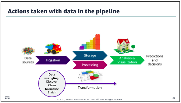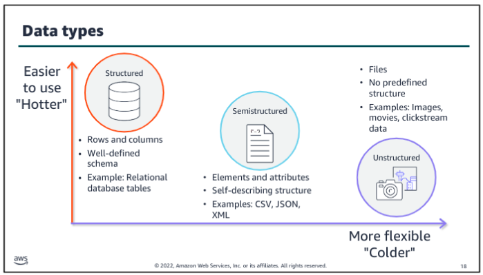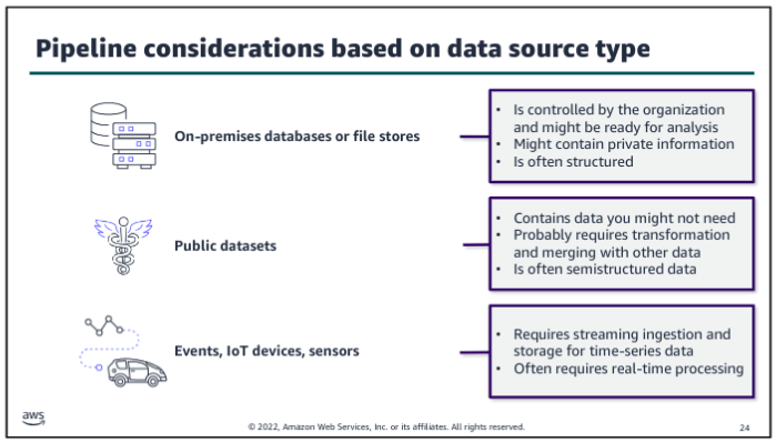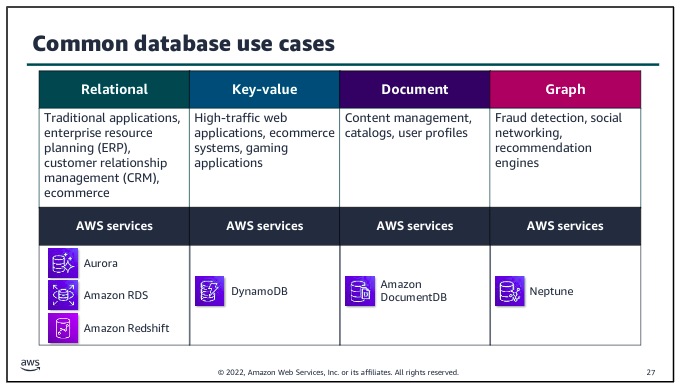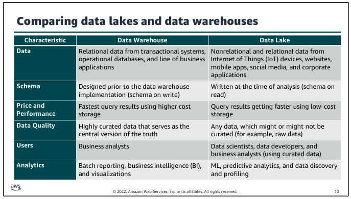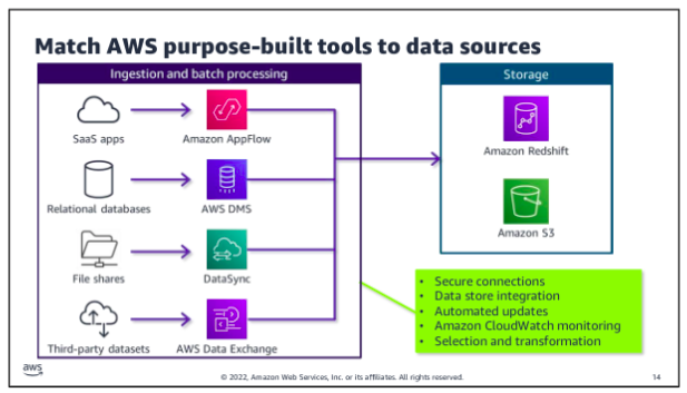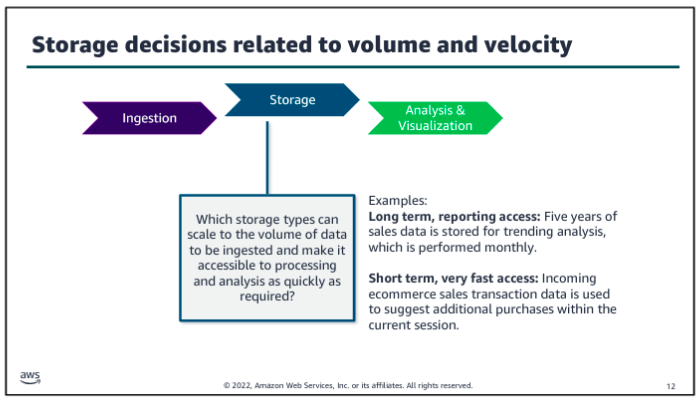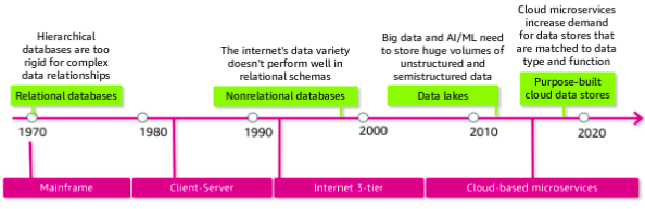 Choosing the right purpose built database is key when selecting the application architecture that will support your analytics or ML workload. The database service that you choose will affect the volume and variety of what your application can handle, and determine what type of data is stored and the format it’s stored in.