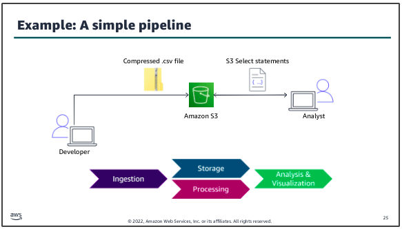 The dataset to be ingested into the pipeline is a .csv file that contains structured data. A developer uses a utility to compress the file, then uploads the file to an S3 bucket for storage. The data science team who will analyze the data can use S3 Select statements to directly query the data in Amazon S3.
