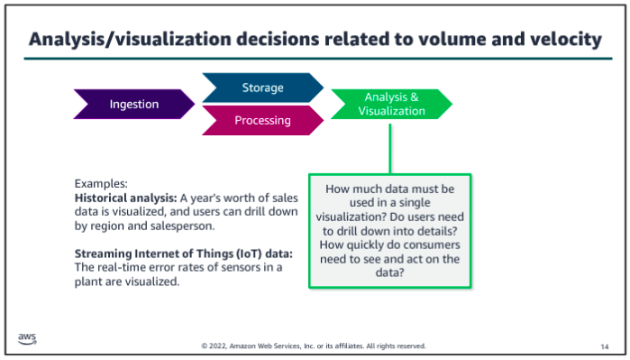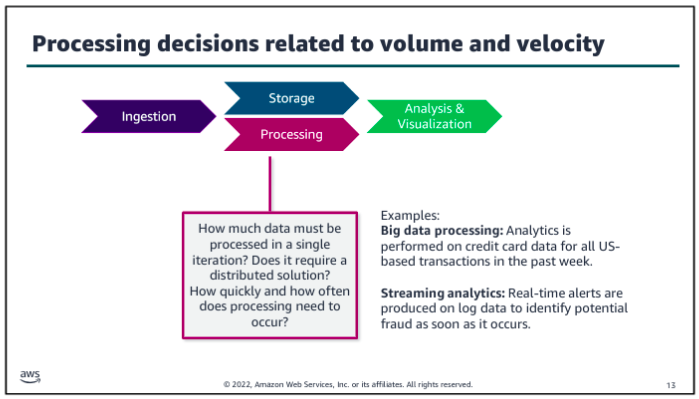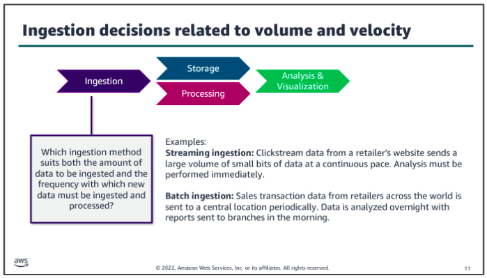 Consider volume and velocity together because you will make infrastructure decisions about how to collect, store, and process data based on the combination of how much data you need to ingest and how quickly you will ingest it.
