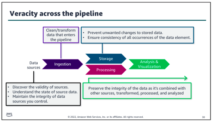 - Transfer the data securely into the pipeline. Make sure that you establish mechanisms to audit the ingestion process to ensure the veracity of the data in the pipeline.