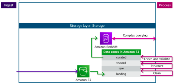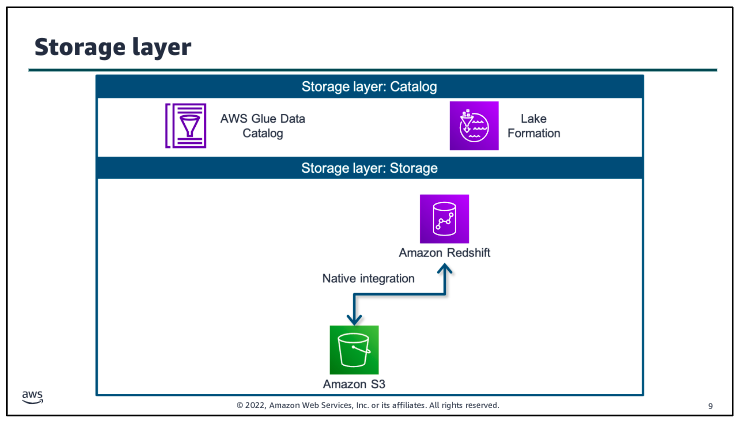 The catalog layer in the storage layer stores business and technical metadata about datasets that are hosted in the storage layer. This metadata supports the ability to find and query data that is stored in the data lake and the data warehouse. In the AWS architecture, AWS Lake Formation and AWS Glue work together to collect and store metadata and make it available when needed. The catalog makes it easier for consumers to search for and explore the available data.