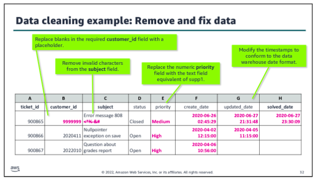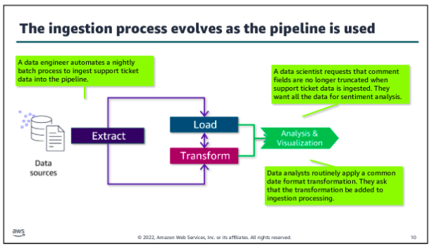 Data will almost always be transformed as it moves through the pipeline. This might include modifying the format to support a specific analysis tool or replacing values (for example, zeroes in place of nulls). You might also augment the dataset by filling in gaps or enriching it with additional information. For example, in traditional data science architectures, the extract, transform, and load (ETL) process takes data from one source, performs some type of transformation on it, and then loads it into another location where the analysis is done.