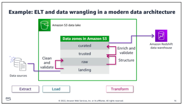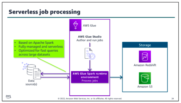 - Perform severless ETL processing in the AWS Glue Spark runtime engine.