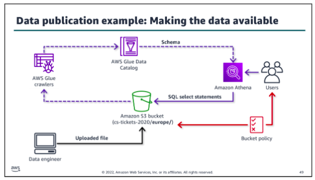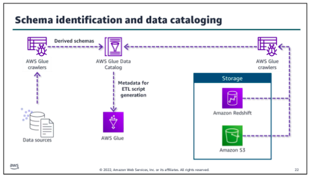 As a data engineer, you might now always know the schema of the data that you need to analyze. AWS Glue is designed for this situation. You can direct AWS Glue to data that is stored on AWS, and the service will discover your data. AWS Glue will then store the associated metadata (for example, the table definition and schema) in the AWS Glue Data Catalog. You accomplish this by creating a crawler, which inspects the data source and infers a schema based on the data. You can direct the crawler to data that is stored in an S3 bucket, and the crawler discovers the data. Then, the crawler stores the associated metadata (the table definition and schema) in a Data Catalog. The team can now use crawlers to inspect data sources quickly and reduce the manual steps to create database schemas from data sources in Amazon S3. You can use Athena to query in a database that an AWS Glue crawler created. You ca also integrate an AWS Glue into a CloudFormation template.