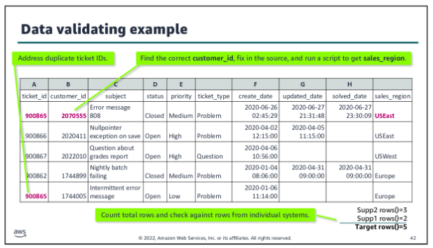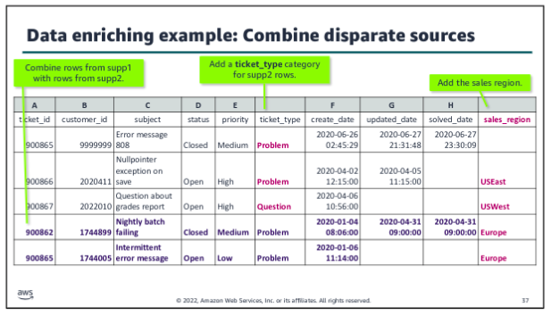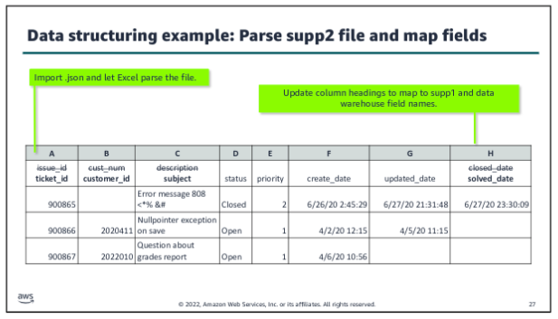 Orchestration is especially important when you move beyond the simple example to a more complex ingestion process. For example, what if you were now asked to collect and include customer comments from the tickets to feed an ML model as part of analyzing the relationship between customer support experiences and contract renewals? Now you need to collect and wrangle an additional subset of unstructured data, and you would need to label it and take other steps to use it in an ML application. A workflow helps to manage the complexities of this type of ingestion.