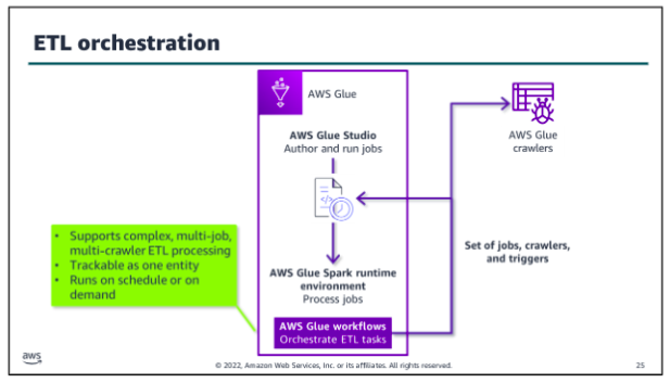 To orchestrate complex ETL processes, use AWS Glue workflows. Workflows work with the runtime engine to make it easier to design multi-job, multi-crawler ETL processes. You can run and track and track a workflow as a single entity. After you create a workflow and specify the jobs, crawlers, and triggers that are associated with it, you can run the workflow on demand or on a schedule: