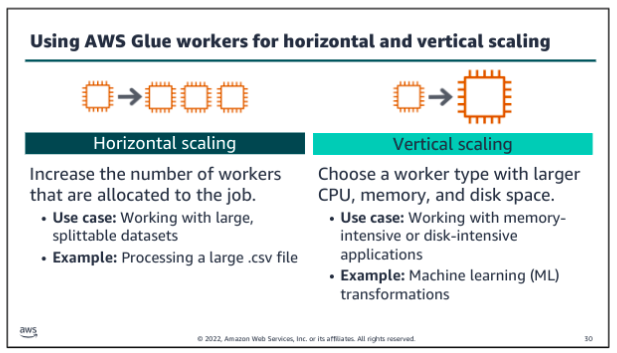 Much of the tuning of the AWS Glue jobs will depend on how Spark distributes and processes your data based on the volume and type of data that is being ingested and the type of processing being performed on it. Spark is a distributed processing system, which means that is allocates processing across nodes. Spark takes steps to use its infrastructure to keep up with processing requests.