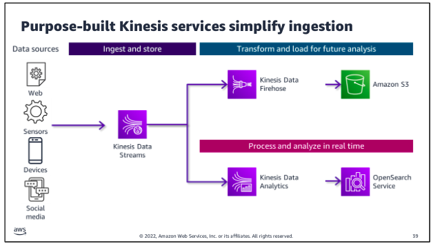 Amazon Kinesis Data Streams is specifically designed to ingest, process, and store streaming data for analytics. There are two paths for streaming ingestion. In the top path, streaming data is collected into the stream and stored for future use. In the second path, data is processed as it is ingested to feed real-time analytics. Producers put data onto a Kinesis Data Stream, which provides durable storage for the data. More than one producer can write to the stream. Consumers get the data from the stream and process it. The stream is a kind of buffer between the incoming data and the processors of that data. 0