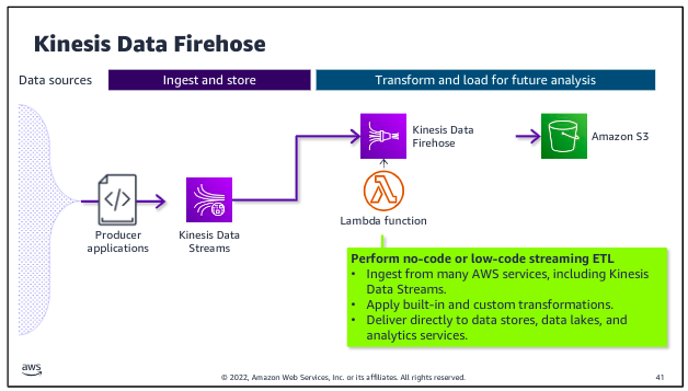 Kinesis Data Firehose is designed to ingest and deliver streaming data directly to data lakes on Amazon S3, as well as data stores and analytics services such as Amazon Redshift and Amazon OpenSearch Service. Kinesis Data Firehose also has the ability to run built-in transformations or custom transformations that you create by using a Lambda function that runs on the streaming data before it is delivered to specified destination.