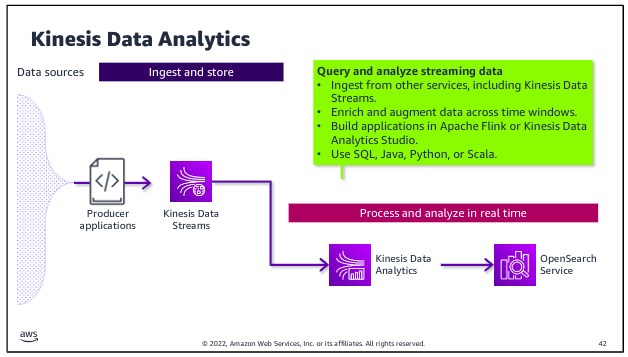 Kinesis Data Analytics is purpose built to perform analytics on streaming data as it passes through the stream and to deliver data directly to tools for real-time analytics. For example, you might perform calculations to derive new fields or to aggregate values over a sliding time window within the incoming stream. You could then write the results to OpenSearch Service, where the results are available for Amazon OpenSearch Dashboards or other analytics and visualization tools.