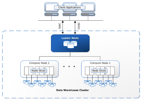 Clusters are the main infrastructure component of an Amazon Redshift data warehouse. A cluster is made up of one or more compute nodes. If a cluster has more than one node, then one of the nodes is the leader node, and the other nodes are compute nodes. Client applications interact with the leader node.
