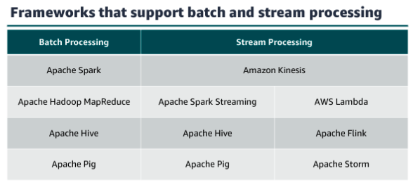 When you launch your cluster, you choose the frameworks and applications to install that best fit your data processing needs. Frameworks are the data processing engines that are used to process and analyze your data. You can select frameworks based on whether your data processing is batch, interactive, in-memory, streaming, or something else. Hadoop and Spark are the two most common frameworks that amazon EMR uses.