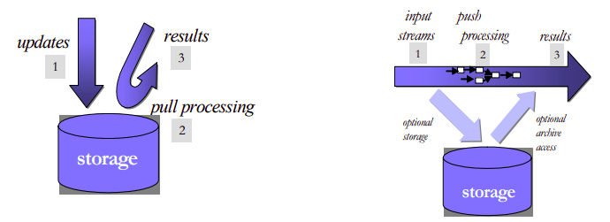 | Processing Model | Pull model: System pulls data from storage to process queries. | Push model: Incoming data is pushed through queries for immediate processing. |