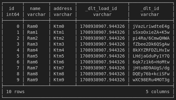 yield {'id':i, 'name':f'Ram{i}', 'address':f'Ktm{i}'}dlt uses the state internally to implement last value incremental loading. This use case should cover around 90% of your needs to use the pipeline state. If not: