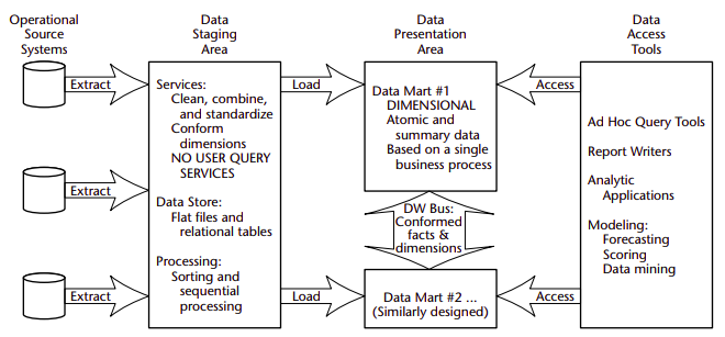 The data staging area of the data warehouse is both a storage area and a set of processes commonly referred to as extract-transformation-load (ETL). The data staging area is everything between the operational source systems and the data presentation area. It is somewhat analogous to the kitchen of a restaurant, where raw food products are transformed into a fine meal. In the data warehouse, raw operational data is transformed into a warehouse deliverable fit for user query and consumption.