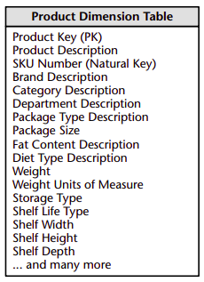 Dimension tables are integral companions to a fact table. The dimension tables contain the textual descriptors of the business. Dimension tables are integral companions to a fact table. The dimension tables contain the textual descriptors of the business. We strive to include as many meaningful textlike descriptions as possible. It is not uncommon for a dimension table to have 50 to 100 attributes. Dimension tables tend to be relatively shallow in terms of the number of rows (often far fewer than 1 million rows) but are wide with many large columns. Each dimension is defined by its single primary key, designated by the PK notation in our example which serves as the basis for referential integrity with any given fact table to which it is joined.