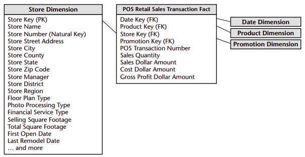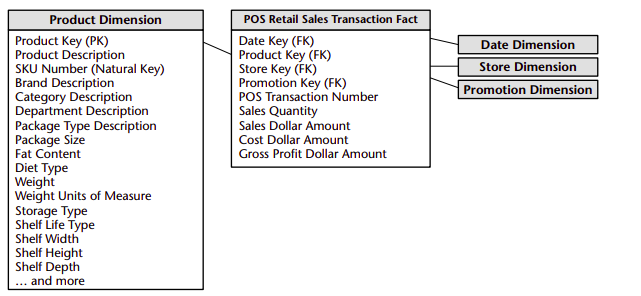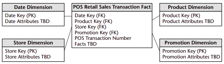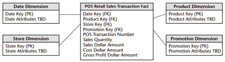 The first step in the design is to decide what business process(es) to model by combining an understanding of the business requirements with an understanding of the available data. The management wants to better understand customer purchases as captured by the POS system. Thus the business process we’re going to model is POS retail sales. The most granular data is an individual line item on a POS transaction. Once the grain of the fact table has been chosen, the date, product, and store dimensions fall out immediately. Of course, you can always declare higher-level grains for a business process that represent an aggregation of the most atomic data. However, as soon as we select a higher-level grain, we’re limiting ourselves to fewer and/or potentially less detailed dimensions.
