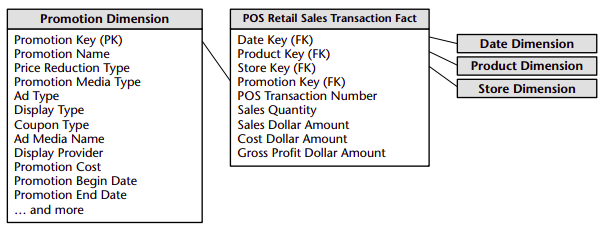 The promotion dimension is potentially the most interesting dimension in our schema. The promotion dimension describes the promotion conditions under which a product was sold. Promotion conditions include temporary price reductions, end-aisle displays, newspaper ads, and coupons. This dimension is often called a causal dimension (as opposed to a casual dimension) because it describes factors thought to cause a change in product sales. Whether the products under promotion experienced a gain in sales during the promotional period. This is called the lift. The causal conditions potentially affecting a sale are not necessarily tracked directly by the POS system. The transaction system keeps track of price reductions and markdowns. The presence of coupons also typically is captured with the transaction because the customer either presents coupons at the time of sale or does not. Ads and in-store display conditions may need to be linked from other sources.