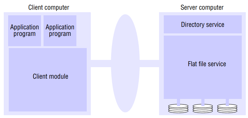 An architecture that offers a clear separation of the main concerns in providing access to files is obtained by structuring the file service as three components - a flat file service, a directory service and a client module. An abstract architectural model that underpins both NFS and AFS.