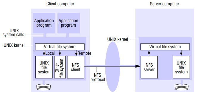 - The NFS client module plays the role described for the client module in flat service model, supplying an interface suitable for use by conventional applications programs. But unlike our client module, it emulates the semantics of the standard UNIX file system primitives precisely and is integrated with UNIX kernel. It is integrated with the kernel and not supplied as a library for loading into client processes so that user programs can access files via UNIX system calls without recompilation or reloading.