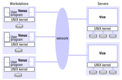AFS is implemented as two software components that exist as UNIX processes called Vice and Venus. Vice is the name given to the server software that runs as a user-level UNIX process in each server computer, and Venus is a user-level process that runs in each client computer and corresponds to the client module in our abstract model.