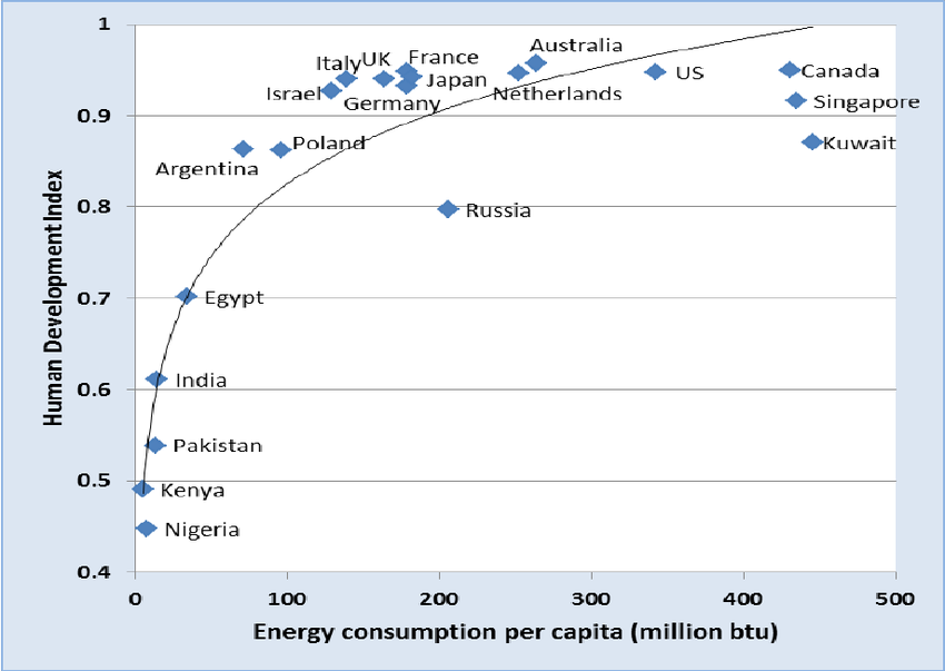 Energy consumption of Nepal: 425 kg of oil equivalent (2014, google) Energy consumption of USA: 6,804 kg of oil equivlaent (2014, google)