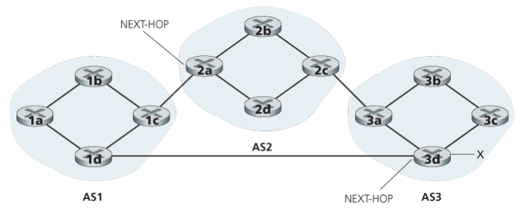 Providing the critical link between the inter-AS and intra-AS routing protocols, the NEXT-HOP attribute has a subtle but important use. The NEXT-HOP is the IP address of the router interface that begins the AS-PATH. In the same example, the NEXT-HOP attribute for the route “AS2 AS3 x” from AS1 to x that passes through AS2 is the IP address of the left interface on router 2a. The NEXT-HOP attribute for the route “AS3 x” from AS1 to x that bypasses AS2 is the IP address of the leftmost interface of router 3d.