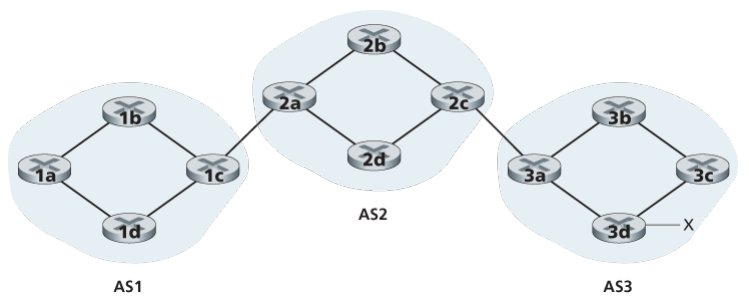 In order to propagate the reachability information, both iBGP and eBGP sessions are used. In this process, gateway router 3a first sends an eBGP message “AS3 x” to gateway router 2c. Gateway router 2c then sends the iBGP message “AS3 x” to all of the routers in AS2, including to gateway router 2a. Gateway router 2a then sends the eBGP message “AS2 AS3 x” to gateway router 1c. Finally, gateway router 1c uses iBGP to send the message “AS2 AS3 x” to all the routers in AS1. After this process is complete, each router in AS1 and AS2 is aware of the existence of x and is also aware of an AS path that leads to x.