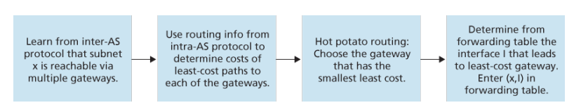 The 1b router will learn about two possible BGP routes to prefix x. In hot potato routing, the route chosen is that route with the least cost to the NEXT-HOP router beginning that route. In this example, router 1b will consult its intra-AS routing information to find the least-cost intra-AS path to NEXT-HOP router 2a and the least-cost intra-AS path to NEXT-HOP router 3d, and then select the route with the smallest of these least-cost paths.