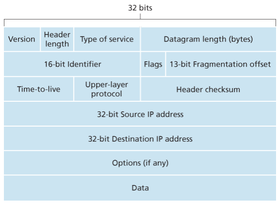 - Source and destination IP addresses: When a source creates a datagram, it inserts its IP address into the source IP address filed and inserts the address of the ultimate destination into the destination IP address field.