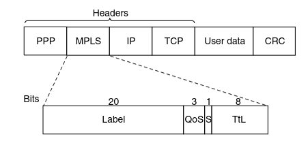 The generic MPLS header is 4 bytes long and has four fields. Most important is the Label field, which holds the index. The QoS field indicates the class of ser- vice. The S field relates to stacking multiple labels (which is discussed below). The TtL field indicates how many more times the packet may be forwarded. It is decremented at each router, and if it hits 0, the packet is discarded. This feature prevents infinite looping in the case of routing instability
