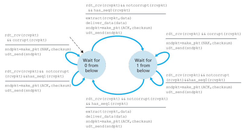The receiver-side has a single state, on packet arrival, the receiver replies with either an ACK or NAK, depending on whether or not the received packet is corrupted.