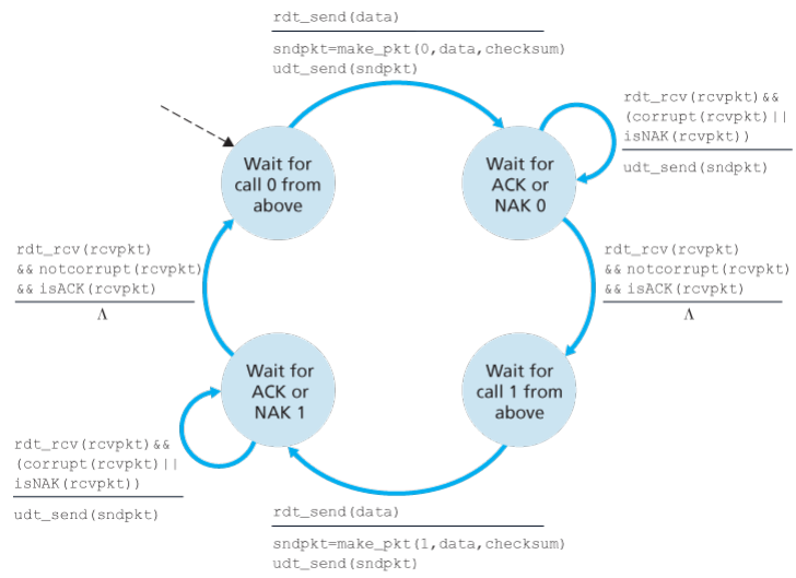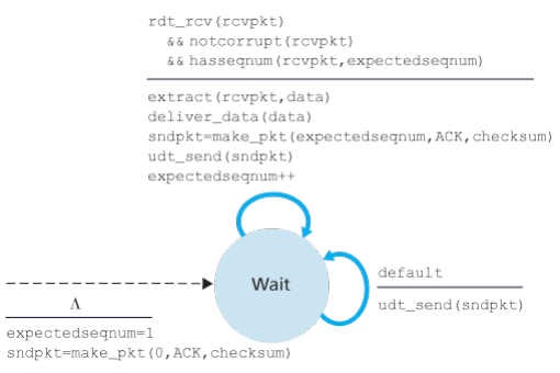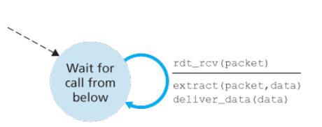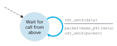 The sending side has two states, one waiting for data to be passed down the upper layer when rdt_send() occurs, the sender will create a packet containing the data to be sent, along with a packet checksum, after which enters waiting state where it cannot get more data from the upper layer; that is rdt_send() event cannot occur.