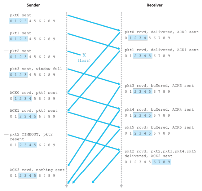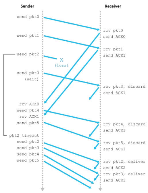 - Since packets are delivered one at a time to the upper layer, if packet has been received and delivered, then all packets with a sequence number lower than have also been delivered.