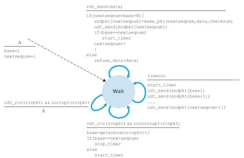 - Invocation from above When rdt_send() is called from above, the sender first checks to see if the window is full, if not a packet is created and sent, if full, the sender simply returns the data back to upper layer, an implicit indication that the window is full, in a real implementation, the sender would more likely have either buffered but not immediately sent this data, or would have a synchronization mechanism, that would allows the upper layer to call rdt_send() only when the window is not full.