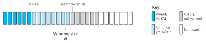 corresponds to packets that have already been transmitted and acknowledged. corresponds to packets that have been send but not yet acknowledged. can be used for packets that can be sent immediately should data arrive from the upper layer. cannot be used until an acknowledgment packet currently in the pipeline has been acknowledged.