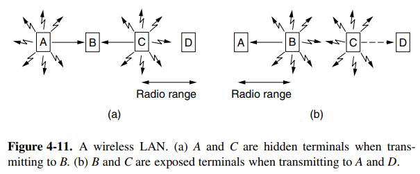 An early and influential protocol that tackles these problems for wireless LANs is MACA (Multiple Access with Collision Avoidance). The basic idea behind it is for the sender to stimulate the receiver into outputting a short frame, so stations nearby can detect this transmission and avoid transmitting for the duration of the upcoming (large) data frame. This technique is used instead of carrier sense. (some earlier weird protocols are here not used in 802.11 hai)