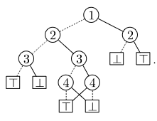 - First, it must be ordered. Whenever a LO or HI arc goes from branch node to branch node , we must have . Thus, in particular, no variable will ever be queries twice when the function is evaluated.